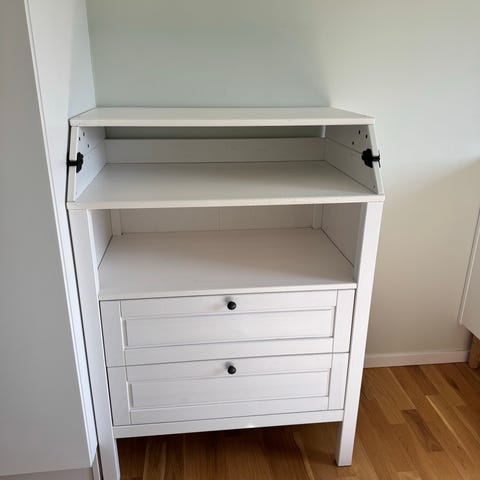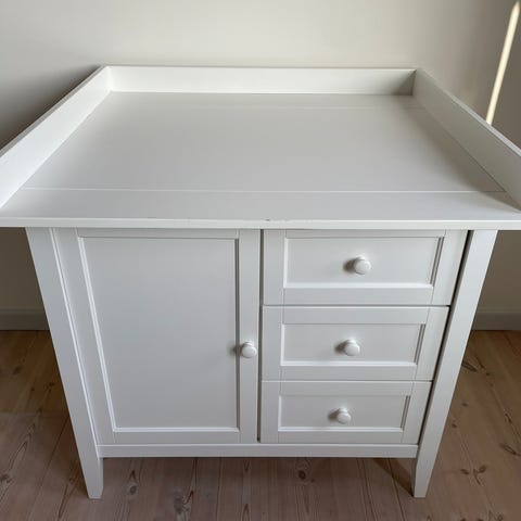 IKEA skötbord med byrå i vit färg. Möbeln har en skötyta upptill med upphöjda kanter samt flera lådor och ett skåp med hyllplan för förvaring av blöjor, kläder och tillbehör. Passar i barnrum eller sovrum där man behöver en kombination av skötplats och förvaring.