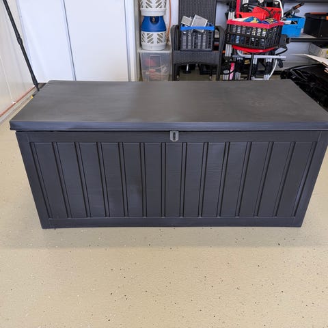 Förvaringslåda för utomhusbruk i plast. Lådan är grå med svart lock och har rektangulär form. Passar för förvaring av exempelvis dynor, trädgårdsredskap eller andra uteprylar på altan eller uteplats. Bredd 120 Djup 55 Höjd 61