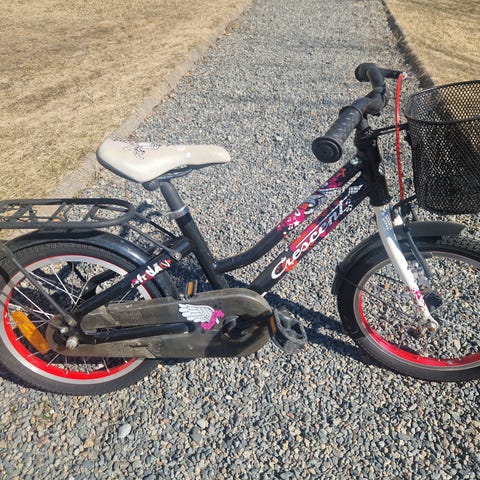 Pakethållare, cykelkorg och stödhjul medföljer.