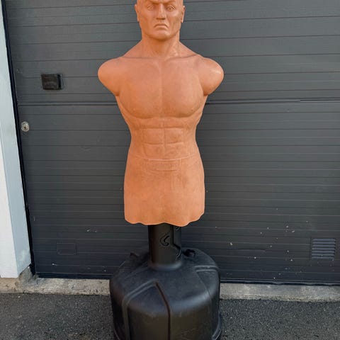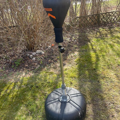 Stående boxdocka/slagdocka i svart färg. Dockan är formad som överkropp med huvud och är monterad på en fristående fot som kan fyllas med exempelvis vatten eller sand för stabilitet. Avsedd för boxning, kampsport och slag- och sparkträning, lämplig för användning inomhus eller utomhus på plan yta.
