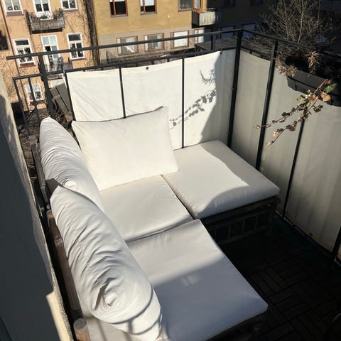 Soffan är i mycket fint skick. Den har mestadels stått på en inglasad balkong och endast varit utomhus det senaste året. Dynorna är väl omhändertagna och har bara tagits fram vid användning. Från ett djur- och rökfritt hem.