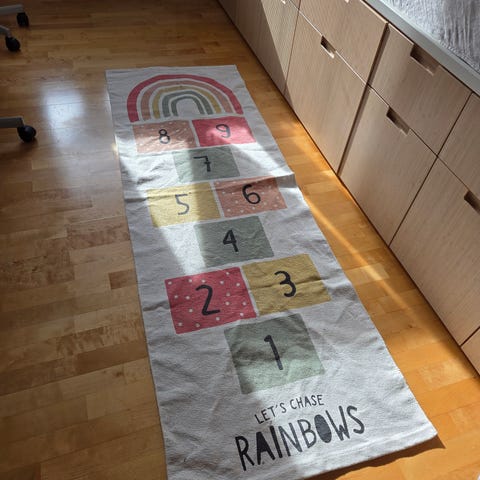 IKEA lekmatta med motiv av hoppa hage. Mattan är grå med vita linjer och siffror i flera färger. Knappt använd enbart lite ludd som går bort.