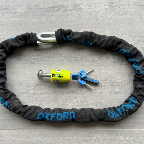Klass 3-godkänt skivbromslås Oxford Patriot med tre nycklar.