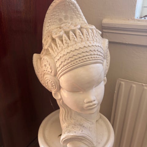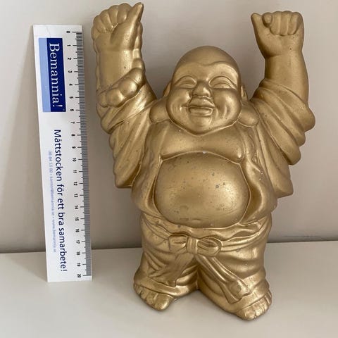 Buddha staty i vit färg med guldfärgade detaljer. Figuren föreställer en sittande Buddha med dekorativa mönster och ett litet lyktliknande föremål i handen. Passar som inredningsdetalj i hemmet. Höjd 50 bred 25 längd 35