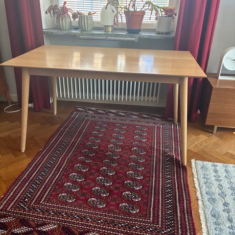 Bra och stabilt matbord i trä. Behöver slipas och lackas om.