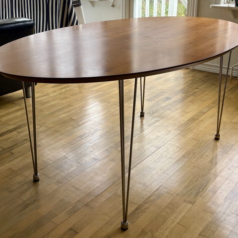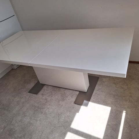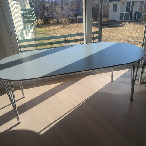 Svart matbord med metallben. Några mindre märken finns. Annars i bra skick. Plats för 10 personer med iläggsskivan i.