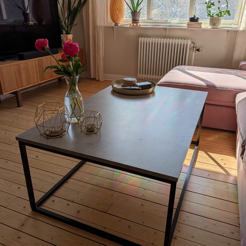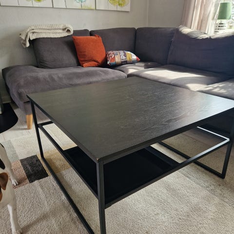 Mio soffbord i svart utförande. Bordsskiva i trä med synliga brädor och benstativ i metall med öppen, kvadratisk ramkonstruktion. Kvadratiskt bord som passar som soffbord eller sidobord i vardagsrum. Neutral färg som fungerar tillsammans med många olika soffor och mattor.