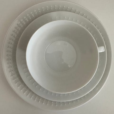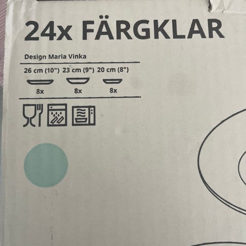 10 tallrikar, 11 djuptallrikar, soppterrin, sås snipa, 5 uppläggningsfat och 1 djupare rund uppläggningsskål.