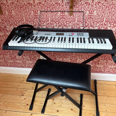 Yamaha YPT-200 keyboard med 61 tangenter i svart utförande. Modellen har inbyggd display och flera funktionsknappar för ljud, rytmer och inställningar. Passar för övning och spel i hemmet, både för nybörjare och mer erfarna användare. På bilderna syns även notställ, stativ och övningshäften som ingår.