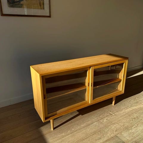 2 skåp med en glashylla inuti (en ny knopp behövs för att stödja ena), samt media uttag.