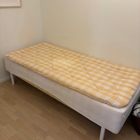 Hästens säng med klassisk blåvit rutmönstrad klädsel. Träram med Hästens-logotyp på undersidan. Passar som fristående säng eller som del i dubbelsängslösning beroende på mått. Lämplig för sovrum eller gästrum. Exakta mått och modellbeteckning kan kontrolleras mot märkning på sängen vid behov.