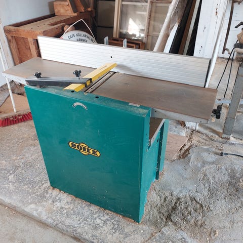 Emco bordsfräs i gul färg. Maskinen är monterad på ett träbord med separat motor under bordet. Arbetsbordet är i metall med frässpår i mitten och justerbart anhåll. Elanslutning med strömbrytare och kabel syns på bilderna. Lämplig för träbearbetning i mindre verkstad eller hobbybruk.hyvelbredd 21cm