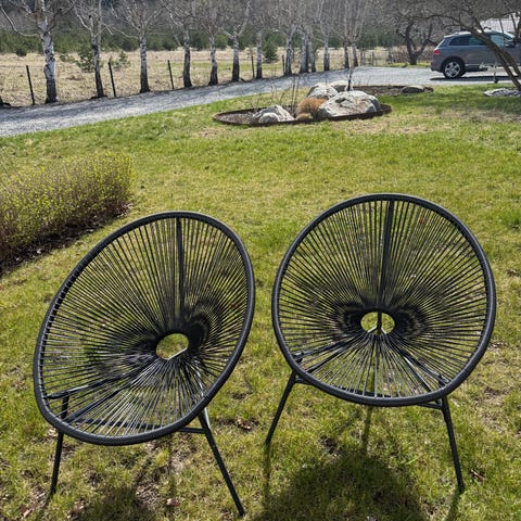 Tre stycken svarta lounchstolar med bord. Bordet är grönt i varpen med glasskiva ovanpå. Möblerna har alltid stått inomhus.