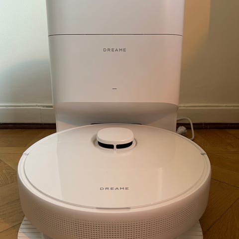 Dreame robotdammsugare i vit färg. Enheten är rund och levereras med laddstation, bruksanvisning och tillbehör enligt bild. Robotdammsugaren är avsedd för automatisk dammsugning av golv i hemmet och kan användas på hårda golv och mattor beroende på underlag och inställningar. Passar för hushåll som vill ha en golvdammsugare som arbetar självständigt runt möbler och hinder.