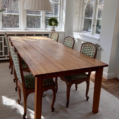 *i gott skick finns fläckar på bordet men det går att slipa upp och impregnera i och med att det är riktigt trä / ek bord och inte laminat.