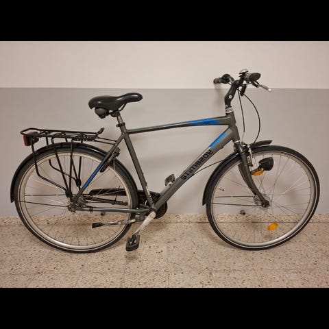 herrcykel i storlek 28 tum i grå färg med blå detalj på ramen. Cykeln . Utrustad med reflexer på hjul och den vardagscykel Utrutad men 7 växlar hand & fot bromsar dinamå lampor lås med 2 nyklar mm.och ärendeåkning i stadsmiljö.