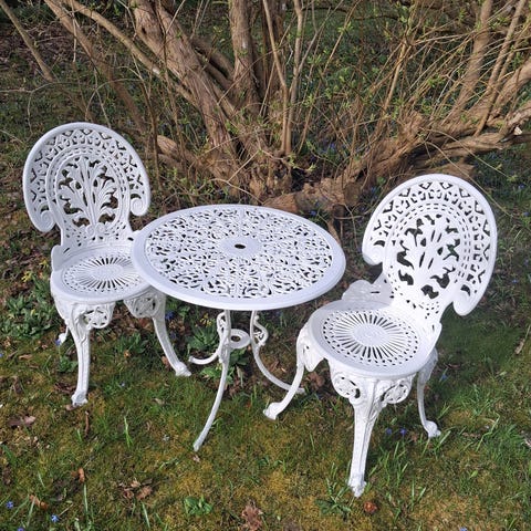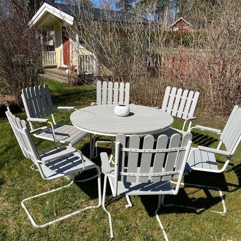 Trädgårdsgrupp runt bord med 4 stolar vit metall
