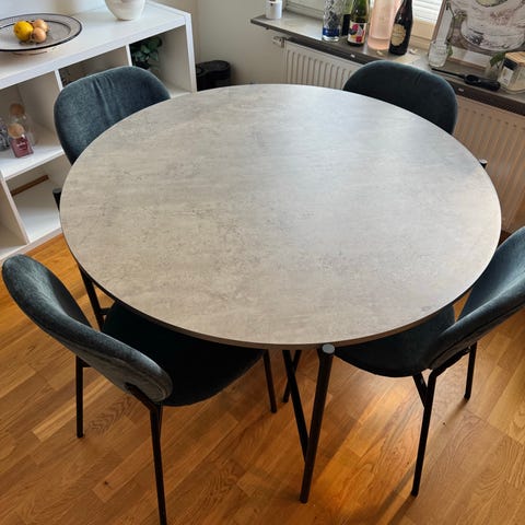 Säljer en rund matbord med fyra stolar pga flytt då vi behöver större i nya lgh. Bordet behövs kanske målas om