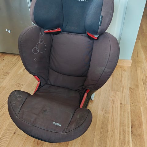 Maxi-Cosi RodiFix bälteskudde i storlek 36. Bilbarnstolen är en framåtvänd bälteskudde med ryggstöd, avsedd att användas tillsammans med bilens trepunktsbälte och Isofix. Modellen på bilderna är i svart tygklädsel. Sätet har justerbart rygg- och huvudstöd för att passa växande barn och ger sidostöd runt huvud och överkropp. Monteras i bilen med Isofix-fästen tillsammans med bilens säkerhetsbälte enligt tillverkarens anvisningar. Passar för barn som har vuxit ur sin bakåtvända bilbarnstol och ska använda bälteskudde med ryggstöd. Använd till två barn, nytvättad klädsel och fullt funktionell.