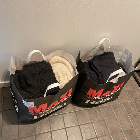 Det är en blandning mellan relativt nya plagg och äldre plagg i storlekarna S-L men mest M. Det är möjligt att det kan finnas något som inte är till användning men det är mycket kläder i dessa kassar som är fina och användbara och allt är nytvättat även om det ligger i dessa soppåsar lite huller om buller.
