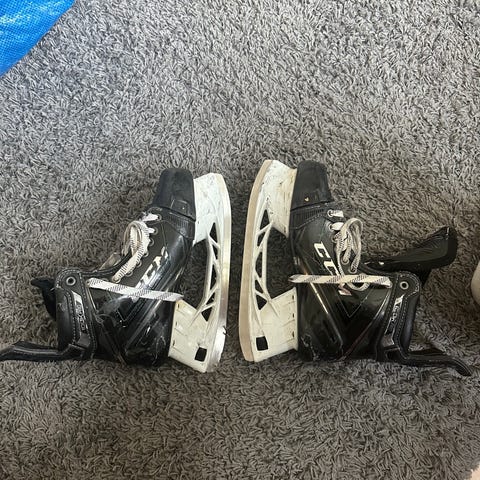 Skridskorna är i storlek 43. Skridskorna är använda lite mindre än 1 säsong , rätt slitna med en spricka under skyddet man ser på en av bilderna, även en trasig öljett, vilket gör att du måste hoppa över ett hål vid snörningen. Därav priset!