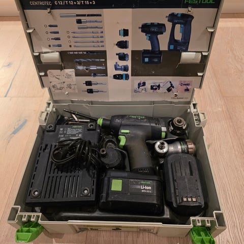 Festool TDK 12 skruvdragare med tillhörande batteri (BPS 12) och laddare (LC 45). Maskinen är batteridriven och har pistolgrepp med gummibeläggning samt steglös hastighetsreglering. Utrustad med chuck för bits och borr. Lämplig för skruvdragning och enklare borrning i trä, plast och liknande material i hem- och hobbybruk eller lättare yrkesanvändning.