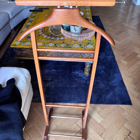 Otroligt fin herrbetjänt som inte kommit till användning. Körsbärsfärgat trä. Lackad mahogny. Made in Italy. 1900-talets senare hälft. På hjultrissor. Perfekt att hänga kostymen eller morgondagens outfit. Plats för slipshängning etc.