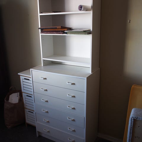 Vit byrå/sekretär med lådor för förvaring.