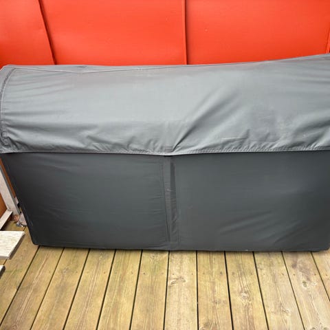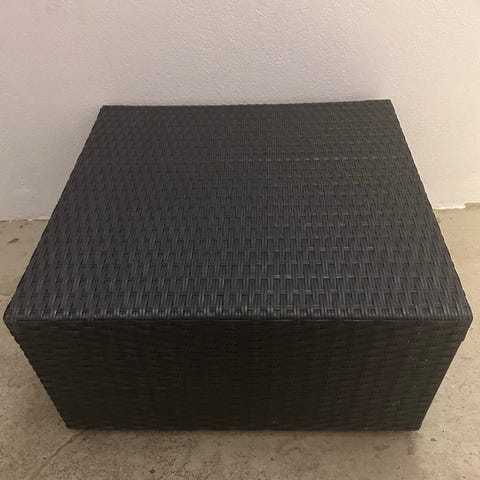Dynbox förvaringslåda från Jysk för utomhusbruk i svart konstrotting. Lådan har en robust konstruktion med gasfjäder för enkel öppning och stängning av locket.