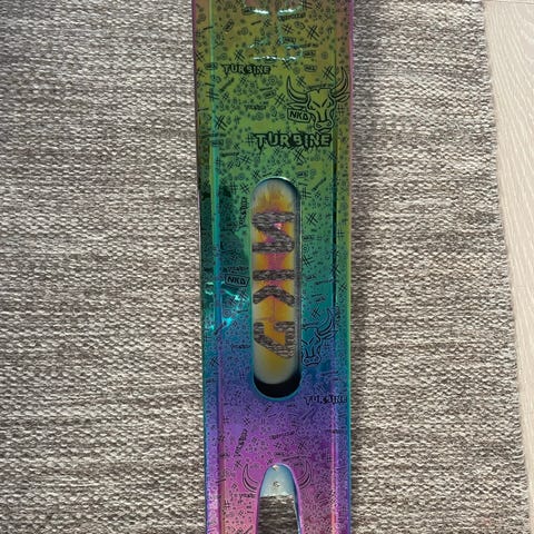 NKD sparkcykel delar i regnbågsfärgad finish. Paketet innehåller styre, deck, gaffel, clamp och hjul med tillhörande delar. Delarna är avsedda för montering av en trick- eller freestyleinriktad sparkcykel. Passar för användare som vill bygga eller uppgradera en sparkcykel med färgmatchade komponenter i metallic/regnbågsfärgad design