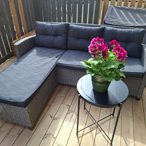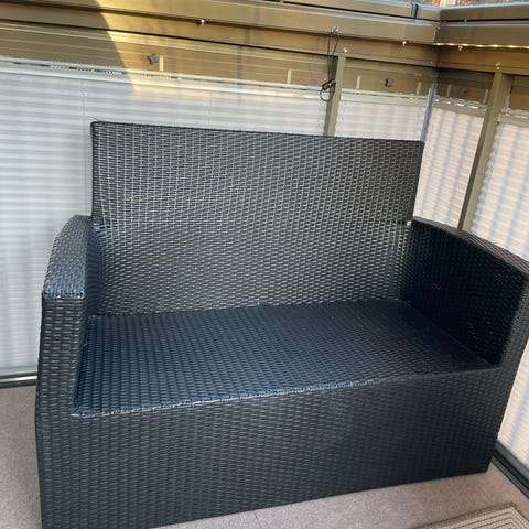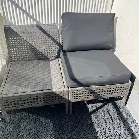 Inköpt ny förra sommaren. Kuddar förvarade inomhus för det mesta och hela soffan i källaren över vintern. Säljer för att jag tyvärr inte har balkong längre. Perfekt för dig som har mindre balkong!