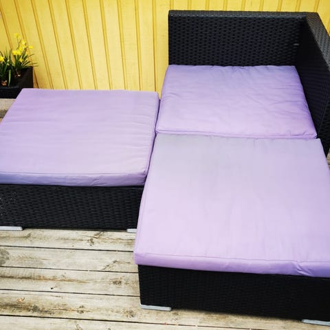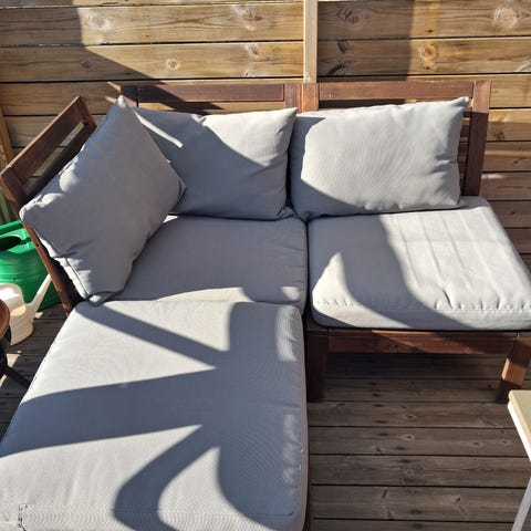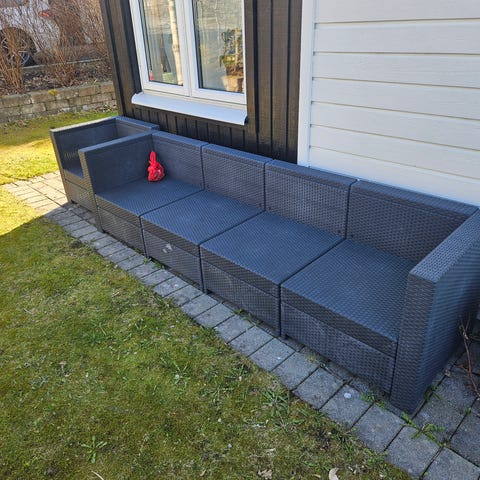 Soffdel med grå sitt- och ryggdynor avsedd för uteplats eller balkong. Träram med raka linjer och lösa, tjocka dynor som ger en rak sittdel. Passar som del av loungesoffa eller som fristående sittplats på mindre ytor som balkong eller altan.