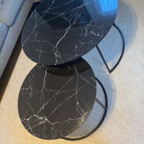 Två st soffbord som dock hänger ihop. De största bordet är 51 cm högt och andra 47 cm. Diagonal största = 50 cm. Diagonal minst 39 cm.