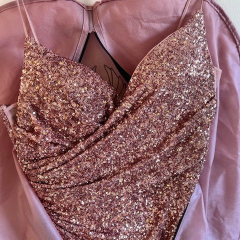 Lång klänning för dam i rosa färg, storlek S. Klänningen har figurnära passform och är dekorerad med mönstrade detaljer och pärl- eller paljettliknande utsmyckningar fram och bak.
