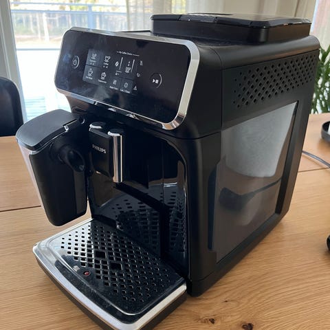Philips helautomatisk espressomaskin i svart utförande. Maskinen har inbyggd kaffekvarn och frontpanel med digital display och tryckknappar för val av olika kaffedrycker. Utrustad med ång-/mjölkskummare på framsidan för tillredning av varma mjölkbaserade drycker. Droppbricka och kaffeutlopp är placerade framtill för enkel rengöring och användning.