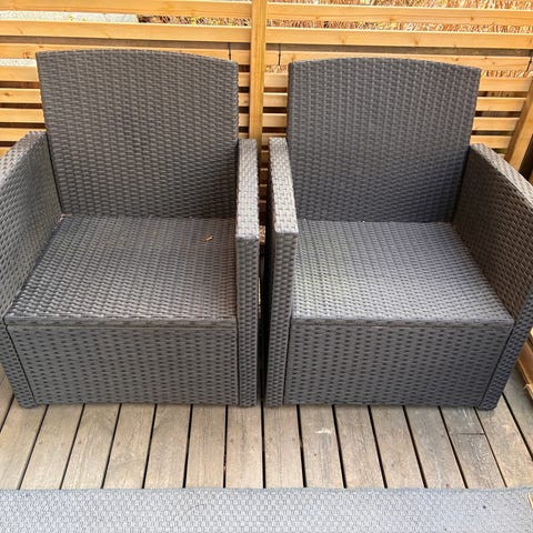 Två fåtöljer, hörnsits ( utemöbler) från IKEA Enholmen säljes, inklusive svarta dynor. Går att sätta ihop fåtöljerna till en tvåsitssoffa som på bilden ( fäste som håller ihop delarna följer med ) eller att ha som två separata fåtöljer.