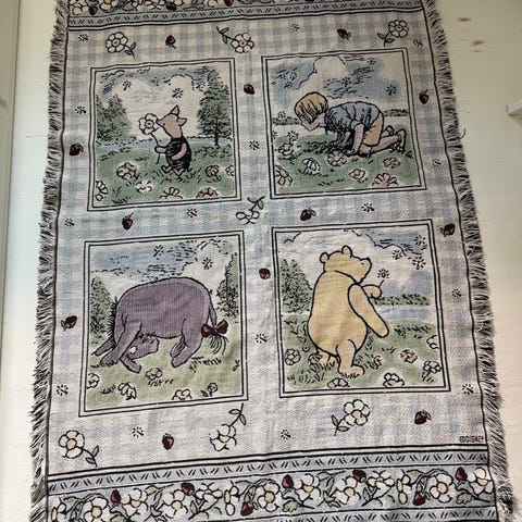 Randig filt i flerfärgat mönster. Flera färger i längsgående ränder ger ett livligt uttryck. Material och exakta mått är okända. 70-tal?