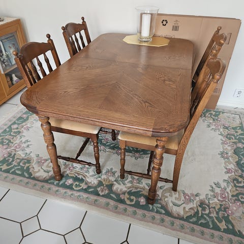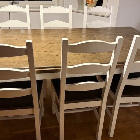 Matgrupp inkl. fyra stolar från Mio. Bord 180x90 + två inläggsskivor. Pris: 2000kr