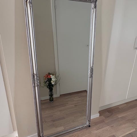 spegel för helkropp i svart ram. Rektangulär modell som kan placeras mot vägg eller hängas upp beroende på montering. Passar i hall, sovrum eller klädkammare för att ge en fullständig spegelbild vid påklädning och vardagsbruk.
