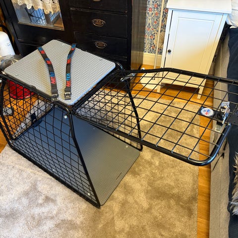 Framdörr med säker, låsbar stängning. Remmar medföljer för att kunna fästa buren stabilt under transport.
