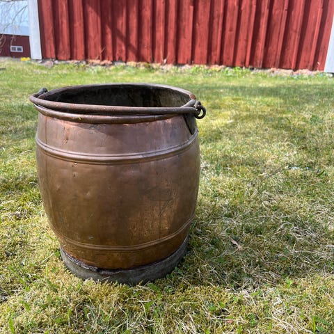 Koppargryta i hamrad koppar med metallhandtag upptill. Passar som inredningsdetalj, förvaring eller dekoration.