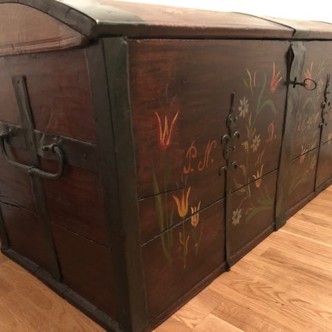En fantastisk brudkista med över 220 års historia. Kistan är daterad 1803 och pryds av vackert måleri i klassiska färger. Den har kvar sina genuina, handsmidda järnbeslag och bär på en underbar patina som bara tiden kan ge.