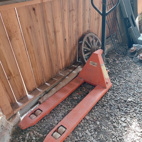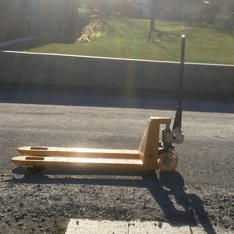 Manuell palltruck. Robust äldre modell. Bruksskick.