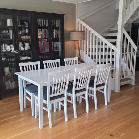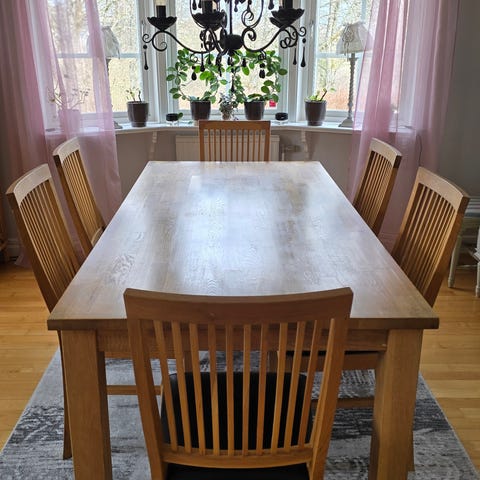 Säljer en fin och gedigen matgrupp i massiv ljus ek med vita ben.