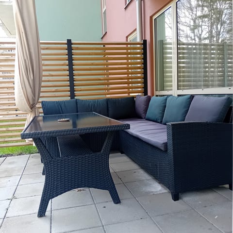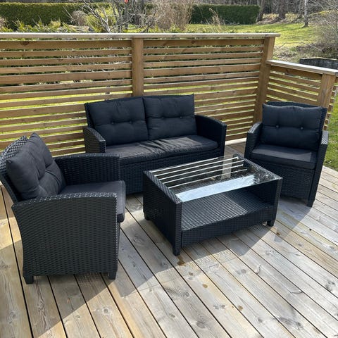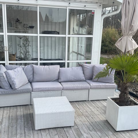 Loungesoffa för utomhusbruk i grå färg med sitt- och ryggdynor. Dynor i bra skick, inte solblekta. Köpt på Bauhaus. Går att ta bort divandelen.
