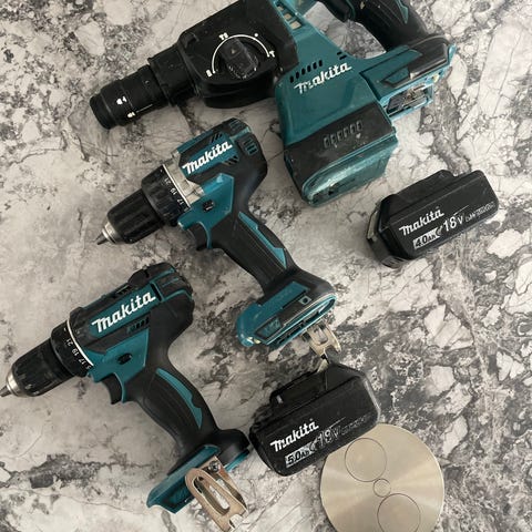 Makita DDF482 borrskruvdragare set i blå färg. Setet innehåller flera batteridrivna maskiner från Makita-serien, bland annat borrskruvdragare och slagborr, samt flera batterier, laddare och diverse borr- och bitsatser. Maskinerna är avsedda för borrning och skruvdragning i trä, metall och andra material vid bygg- och renoveringsarbeten. Alla delar är kompatibla med Makitas 18V-system (enligt märkning på maskinerna).