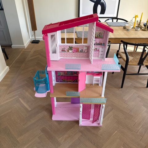 Barbie dockhus i plast med flera våningar och öppningsbara dörrar. Huset är huvudsakligen rosa, lila och turkost med vita detaljer. Insidan har köksdel med spis, kylskåp och diskbänk samt olika tryckta dekorationer på väggarna. Övervåningen har en sovdel med säng och räcke. Huset har också en fungerande hiss med hjälp av den röda korgen som man ser på framsidan. Utsidan har pelare och balkongliknande del. Passar för lek med Barbie-dockor eller liknande dockor i motsvarande storlek.