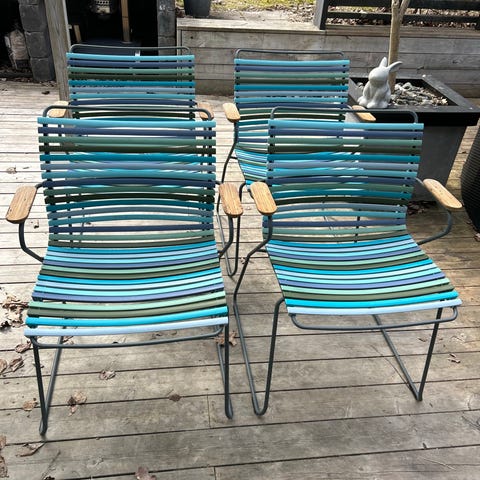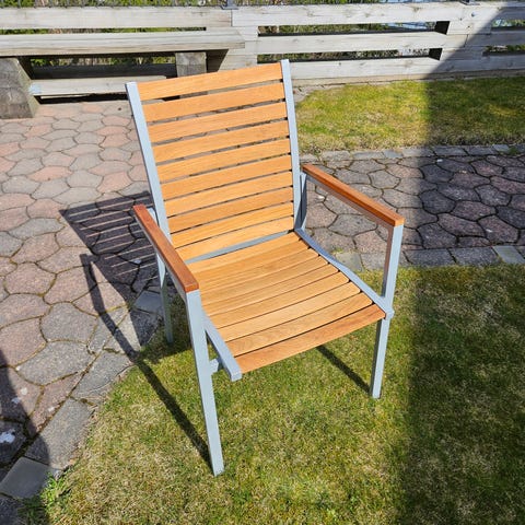 Trädgårdsstolar med träram och flätad sits i ljus, beige ton. Stolarna har armstöd och är utformade för utomhusbruk, exempelvis på altan, balkong eller uteplats. Passar som sittgrupp runt ett mindre bord eller som enskilda sittplatser i trädgården. Bord ingår ej.