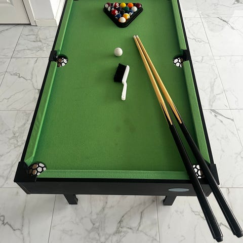 Biljardbord med grön filtduk. Bordet är i mindre format och står på ben som kan placeras på exempelvis ett matbord. Till bordet hör två köer, en uppsättning biljardbollar samt en triangel för uppställning av bollarna. Passar för inomhusbruk i hem- eller fritidsmiljö där det finns begränsat utrymme för ett fullstort biljardbord. Pris kan förhandlas vid snabb affär. Skickas ej