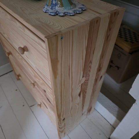 Byrå i furu. Liten vattenskada på skivan. Se bild. Höjd 75, bredd 54 och djup 31 cm.